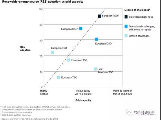 今天很多輸配電網(wǎng)運(yùn)營(yíng)商都面臨這種挑戰(zhàn)。在最近的一次全球電網(wǎng)運(yùn)營(yíng)商的標(biāo)準(zhǔn)討論中,百分之七十的應(yīng)答者表示他們希望增加相關(guān)規(guī)定,比如短期內(nèi)頻繁取消停運(yùn)以及停運(yùn)可再生發(fā)電設(shè)施。這些運(yùn)營(yíng)商面臨的困難程度和他們所處市場(chǎng)中的可再生能源滲透率以及電網(wǎng)容量緊密相關(guān)(圖1)。耦合性高的電網(wǎng)通??梢韵{更多的不可預(yù)知的可再生能源的接入;反之電網(wǎng)冗余度有限的地方,運(yùn)營(yíng)者面臨消納水平更低的挑戰(zhàn)。一些輸配電網(wǎng)運(yùn)營(yíng)商正在處在后者的困境中。