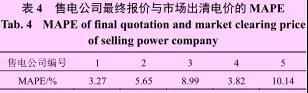 達(dá)到貝葉斯納什均衡后,若各售電公司均按表 3進(jìn)行報價,不考慮網(wǎng)絡(luò)約束, ETC 按各售電公司所報電價由低到高進(jìn)行錄用,售電公司 1 、 2 、 4 售出全部電量,售電公司 3 售出部分電量,而售電公司由于報價太高而沒有被選中。各售電公司采用本文模型制定的報價均低于市場出清價,最終報價與市場出清的MAPE 值見表 4 。