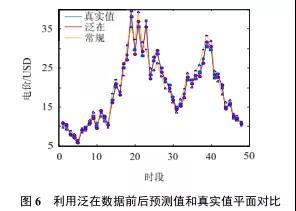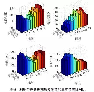 利用 2 個神經(jīng)網(wǎng)絡(luò)分別對 10 月 16 日 48 個點(diǎn)進(jìn)行實時電價預(yù)測。圖 5 為經(jīng)過利用泛在數(shù)據(jù)前后的出清電價預(yù)測值和真實電價值的三維對比圖。圖 6為三者對比的平面圖,即圖 5 的正視圖。