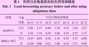如圖 4 所示,依托泛在物聯(lián)網(wǎng)數(shù)據(jù)平臺前后的預(yù)測曲線,從某些細(xì)節(jié) ( 如圖 4 的時段 1~100 和時段300~400) 可見,通過泛在物聯(lián)網(wǎng)提供的更準(zhǔn)確數(shù)據(jù),預(yù)測曲線會更貼近預(yù)測輸入均值。且表 1 顯示,利用泛在數(shù)據(jù)的 MAPE 和 MSE 值比傳統(tǒng)數(shù)據(jù)情況下整體更小,因此證明了計及氣象因素可在一定程度上提高短期負(fù)荷預(yù)測精度。