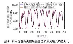 根據(jù)第 2 節(jié)的模型和方法可得到 2016 年 10 月16 — 22 日計及氣象因素影響的負(fù)荷值。將依托泛在物聯(lián)網(wǎng)數(shù)據(jù)平臺前后的負(fù)荷預(yù)測曲線,即 48 節(jié)點(diǎn)的負(fù)荷預(yù)測曲線和 96 節(jié)點(diǎn)的負(fù)荷預(yù)測曲線與預(yù)測輸入平均值進(jìn)行對比,對應(yīng)曲線見圖 4 。此外,MAPE 和 MSE 的對比分析見表 1 。