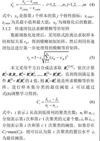 為有效地對樣本進(jìn)行分類,假設(shè)共有 n 個樣本,m 個特性指標(biāo),則可構(gòu)造一個 n×m 的原始矩陣。并采用式 (4) 對歷史電價和負(fù)荷的特性指標(biāo)進(jìn)行數(shù)據(jù)規(guī)格化 ( 歸一化 ) 處理。