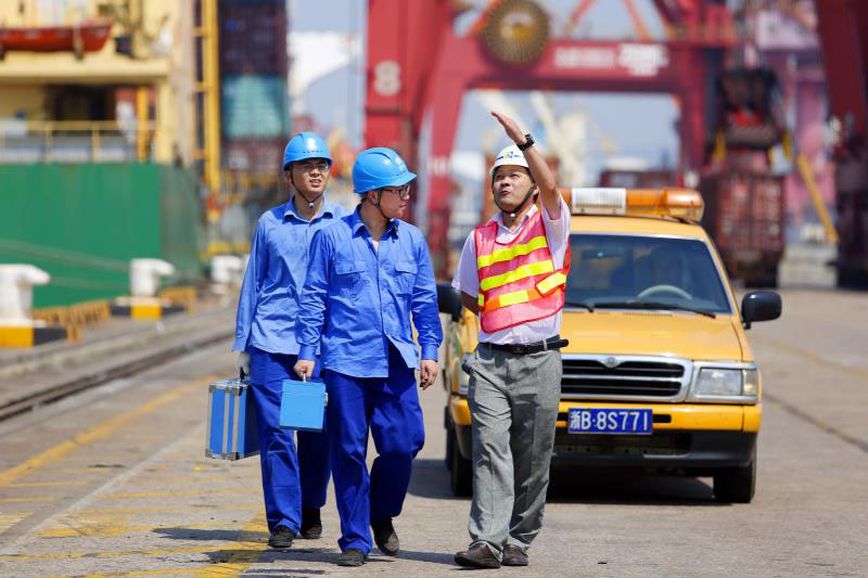 國網(wǎng)寧波供電公司工作人員在北侖梅山港區(qū)交流指導(dǎo)智慧港口岸電建設(shè)。王幕賓 攝