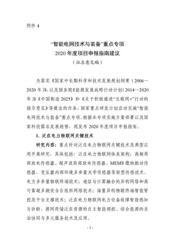 “智能電網(wǎng)技術(shù)與裝備”重點專項2020年度項目申報指南建議