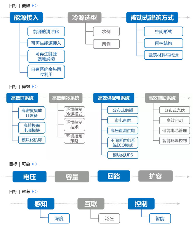 從能源的供給、配置、使用及管理的全過程四個階段提出IDC能源應(yīng)用的現(xiàn)狀,為有的放矢,結(jié)合以上幾個痛點(diǎn),站在時間維度上提出綜合能源解決方案的目標(biāo),從能源的供給、配置、使用及管理上提出供給端低碳、配置端高效,使用端的可靠以及管理端的智慧,實現(xiàn)能源的全過程目標(biāo)管控。