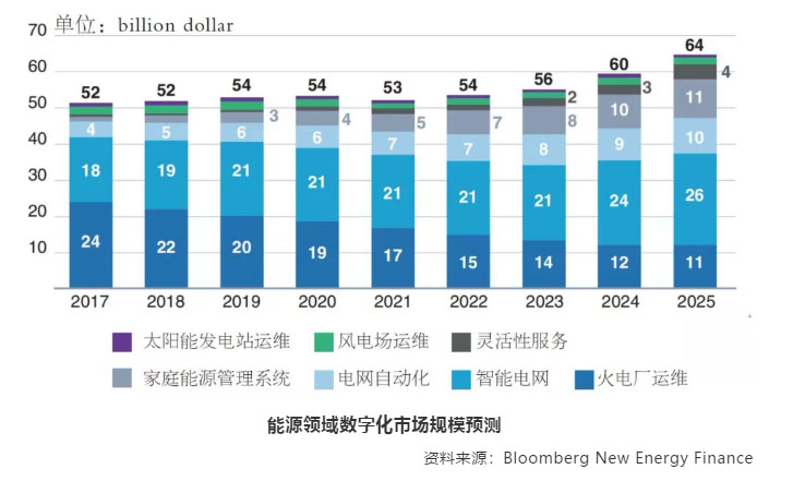 數(shù)字化可以管理更復(fù)雜的能源系統(tǒng),有助于開發(fā)各種新技術(shù)。數(shù)字化是能源的發(fā)展趨勢,未來規(guī)模更大。根據(jù)彭博新能源財經(jīng)(BNEF)的數(shù)據(jù),數(shù)字技術(shù)在能源領(lǐng)域應(yīng)用廣泛,2017年的市場規(guī)模達到520億美元,約占全球數(shù)字技術(shù)應(yīng)用市場的44%。在這520億美元中,有46%(240億美元)用于化石能源電廠的運行管理(如傳感器、數(shù)字采集和解析以提高電廠效率),35%用于智能電表(180億美元)。從現(xiàn)在起到2025年,能源數(shù)字技術(shù)的智能化會發(fā)生重大轉(zhuǎn)變,預(yù)計到2025年,全球能源領(lǐng)域的數(shù)字化市場規(guī)模將增長到640億美元,該數(shù)字技術(shù)應(yīng)用包括大數(shù)據(jù)、機器學(xué)習(xí)/人工智能、云計算、區(qū)塊鏈等。其中,電網(wǎng)自動化預(yù)計將占100億美元,家庭用能系統(tǒng)的規(guī)模也將達到110億美元,超過風(fēng)電光伏運行以及間歇性接入60億美元的市場規(guī)模。
