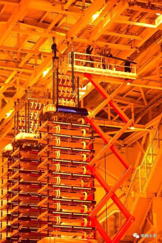 ▼青島換流站核心設(shè)備換流閥正在安裝。