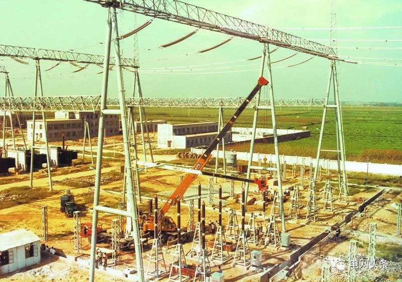 ▼1984年9月開工、1987年11月竣工的山東第一座500千伏變電站——濰坊變電站。圖為安裝施工現(xiàn)場。