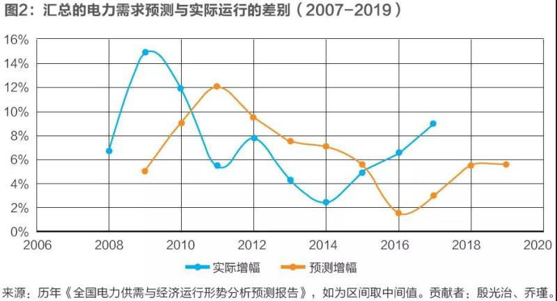 中國電力企業(yè)聯(lián)合會在近些年均會發(fā)布過去一年的電力回顧以及新一年的電力展望。卓爾德中心對這些展望以及實際的電力增長進行了比較。結(jié)果如下??梢钥闯觯瑑H僅是1年的提前量,其預(yù)期與實際的差別也可以用“巨大”來形容。
