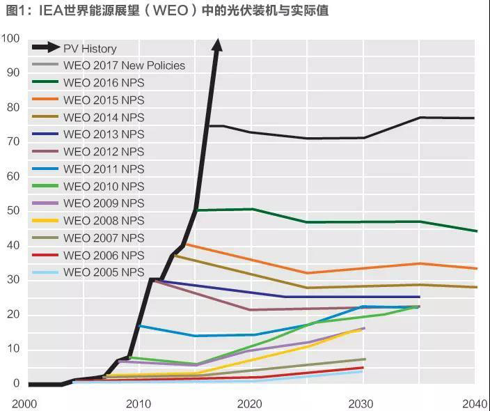 當(dāng)然,這不是我國能源工作者的問題,而是世界各國各機構(gòu)普遍存在的現(xiàn)象。如圖1所示,國際能源署在10年周期以上的光伏預(yù)測結(jié)果偏差過大引來NGO組織的苛責(zé)。