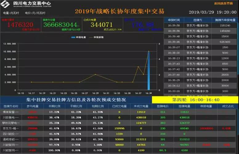 2019年12家掛牌方、224家摘牌方參與平臺(tái)戰(zhàn)略長(zhǎng)協(xié)年度集中交易,共計(jì)開(kāi)展四輪。掛牌方需求1476320兆瓦時(shí),摘牌方總量366683044兆瓦時(shí),四輪累計(jì)成交量344071兆瓦時(shí),成交占比23.31%,成交時(shí)間集中在交易的開(kāi)始和結(jié)束時(shí)段。成交價(jià)格高出預(yù)期套多,以京東方為例,在結(jié)構(gòu)5:2:5前提下,以230元/兆瓦時(shí)成交159996兆瓦時(shí)電量,而5:2:5結(jié)構(gòu)在當(dāng)前多家售電企業(yè)預(yù)期中單價(jià)為195元/千瓦時(shí)(測(cè)算時(shí),戰(zhàn)略長(zhǎng)協(xié)5:2:5結(jié)構(gòu)一般參考該數(shù)值),成交價(jià)格高出預(yù)期23.08%。