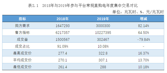 參與平臺(tái)常規(guī)直購(gòu)電年度集中交易的購(gòu)方需求、售方指標(biāo)、價(jià)格均大幅上漲,成交量、成交占比急劇下滑,詳見(jiàn)表2.1。
