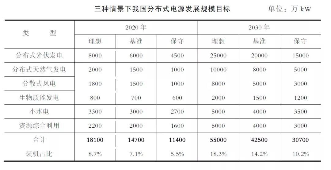 根據國家《能源發(fā)展“十三五”規(guī)劃》《2014—2020 年能源行動計劃》《可再生能源發(fā)展“十三五”規(guī)劃》《電力發(fā)展“十三五”規(guī)劃》相關內容,2020 年分布式光伏發(fā)電、分布式天然氣發(fā)電開發(fā)規(guī)模達到國家規(guī)劃目標,2030 年分布式光伏發(fā)電、分布式天然氣發(fā)電開發(fā)規(guī)模應滿足實現(xiàn)國家戰(zhàn)略目標的要求;分散式風電、生物質能發(fā)電、小水電和資源綜合利用開發(fā)規(guī)模達到相關規(guī)劃或資源量約束目標。