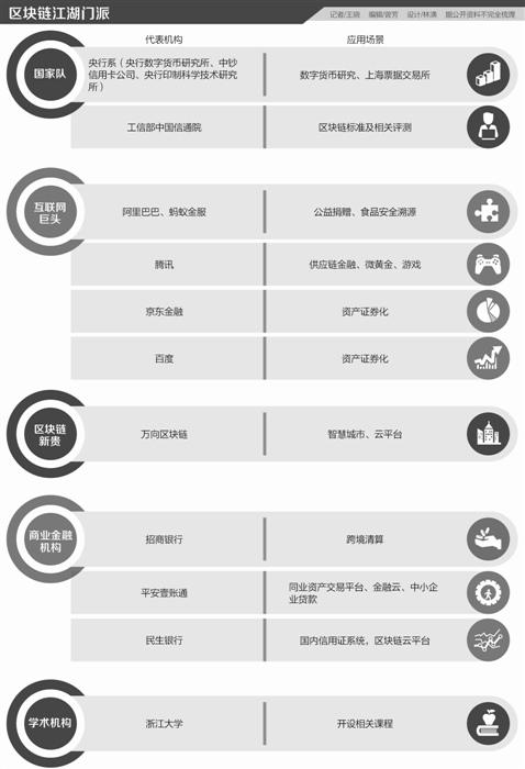 21世紀(jì)經(jīng)濟(jì)報(bào)道記者觀察梳理并與業(yè)內(nèi)人士交流了解到,目前在區(qū)塊鏈技術(shù)研究領(lǐng)域有幾大“門派”:以央行系三家如中鈔信用卡公司、央行印制科學(xué)技術(shù)研究所、央行數(shù)字貨幣研究所以及工信部中國(guó)信息通信研究院等為代表的國(guó)家隊(duì);以螞蟻金服、騰訊、百度、京東、網(wǎng)易為代表的互聯(lián)網(wǎng)巨頭陣營(yíng);區(qū)塊鏈新貴如萬向區(qū)塊鏈股份公司;此外還有如中國(guó)銀行、平安銀行(平安壹賬通)、民生銀行、招商銀行為代表的商業(yè)金融機(jī)構(gòu),以及學(xué)術(shù)機(jī)構(gòu)如浙江大學(xué)等。