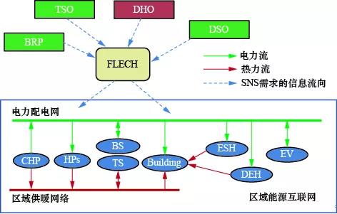 北港(Nordhavn)作為丹麥?zhǔn)锥几绫竟睦细劭趨^(qū)目前正被改造成一個至少擁有4萬居民的新型城市社區(qū)。由丹麥能源技術(shù)發(fā)展和示范基金會(Danish Energy Technology Development and Demonstration Programme,EUDP)出資1 100萬歐元所支持的Energylab Nordhavn項目(2015–2019年)正在北港地區(qū)示范以電熱互聯(lián)為主體的城市區(qū)域能源互聯(lián)網(wǎng)工程。如圖6所示,該工程沿用了FLECH的理念,并將其拓展到熱力系統(tǒng),使該區(qū)域內(nèi)的熱力公司(district heating operator,DHO)也可參與受益。系統(tǒng)中靈活性來源包括大型熱電聯(lián)產(chǎn)設(shè)備,各類熱泵, 大型電力儲能(battery storage,BS)與熱力儲能(thermal storage,TS)設(shè)備,電動汽車(electric vechile,EV),智能樓宇和為低溫區(qū)域供暖系統(tǒng)提供二次升溫的直接加熱設(shè)備(direct electric heater,DEH)以及具有儲能功能的電加熱器等(electric storage heater,ESH)。在靈活性產(chǎn)品方面,該項目截至目前已經(jīng)為區(qū)域內(nèi)所涉獵的4個靈活性需求方設(shè)計了以電、熱負荷聯(lián)合調(diào)度為代表的9類智慧能源網(wǎng)絡(luò)服務(wù)(smart network services,SNSs)產(chǎn)品, 用于優(yōu)化協(xié)調(diào)區(qū)域內(nèi)部電網(wǎng),熱網(wǎng),靈活性設(shè)備,傳統(tǒng)電、熱負荷,以及各相關(guān)利益主體之間的運作。